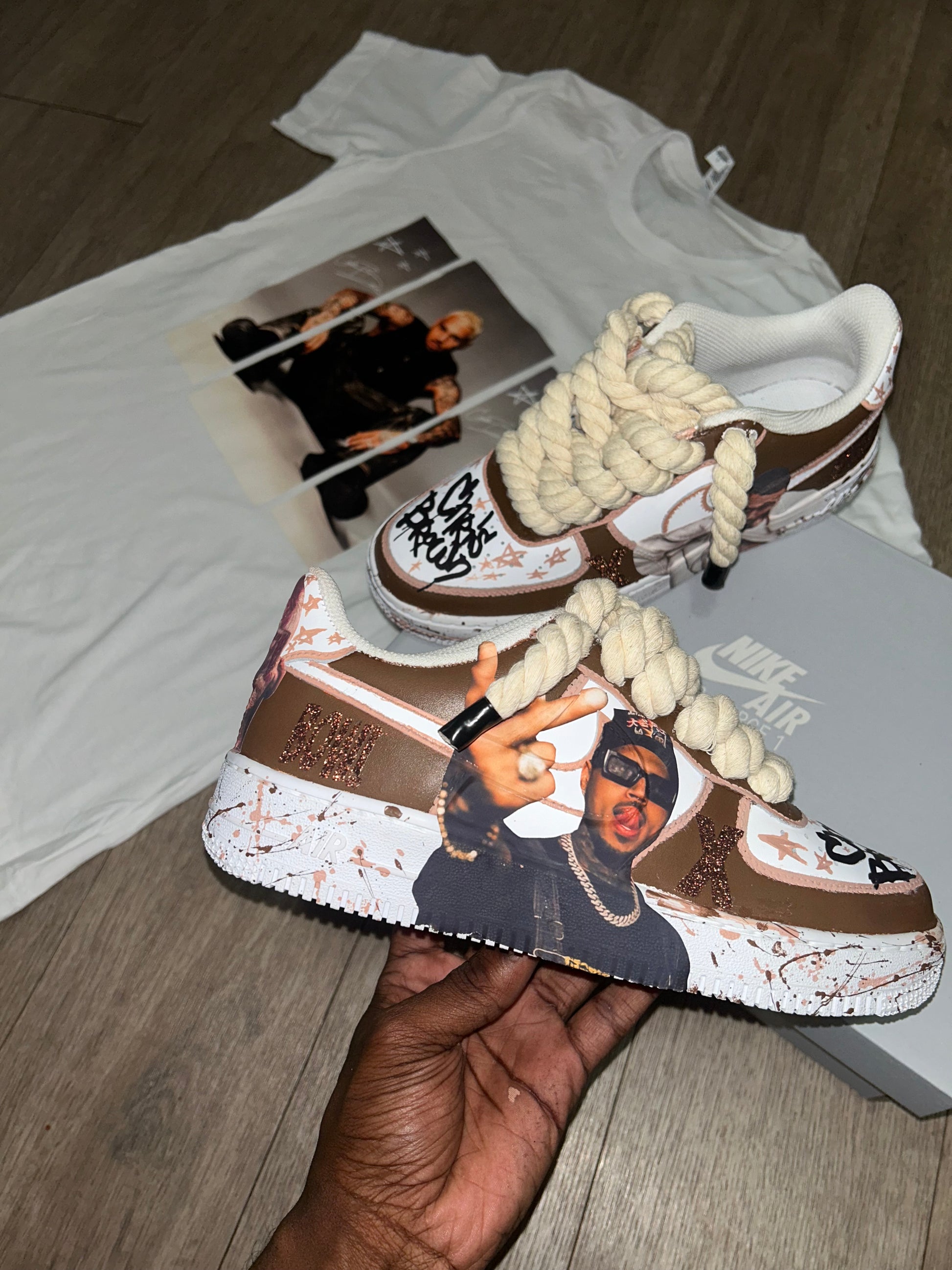 These custom Air Force 1s feature a rich brown and light brown color-blocked base, layered with high-quality photo prints, personalized name detailing, and hand-placed star accents for a bold, standout look.